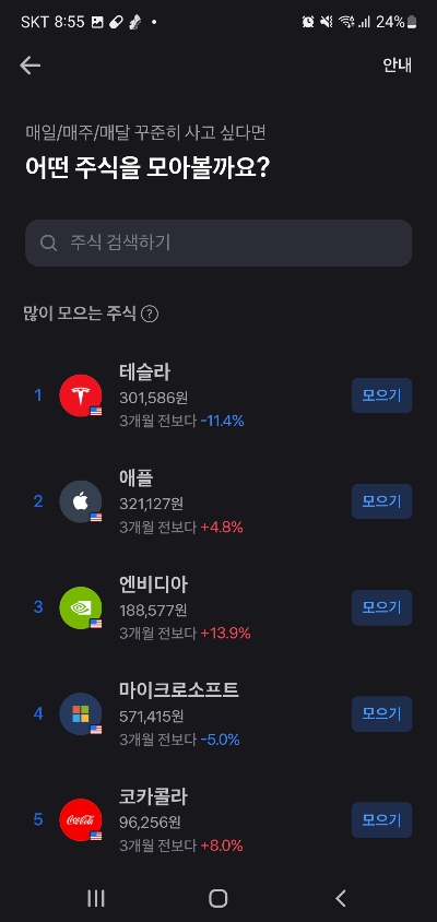 그다음으로 포트폴리오가 아닌 개별로 주식 모으기 버튼을 클릭하신다면, 아래와 같은 화면이 나타납니다. 사람들에게 가장 인기 있는 종목 5가지 표시와 함께, 주식 검색란을 확인할 수 있습니다.