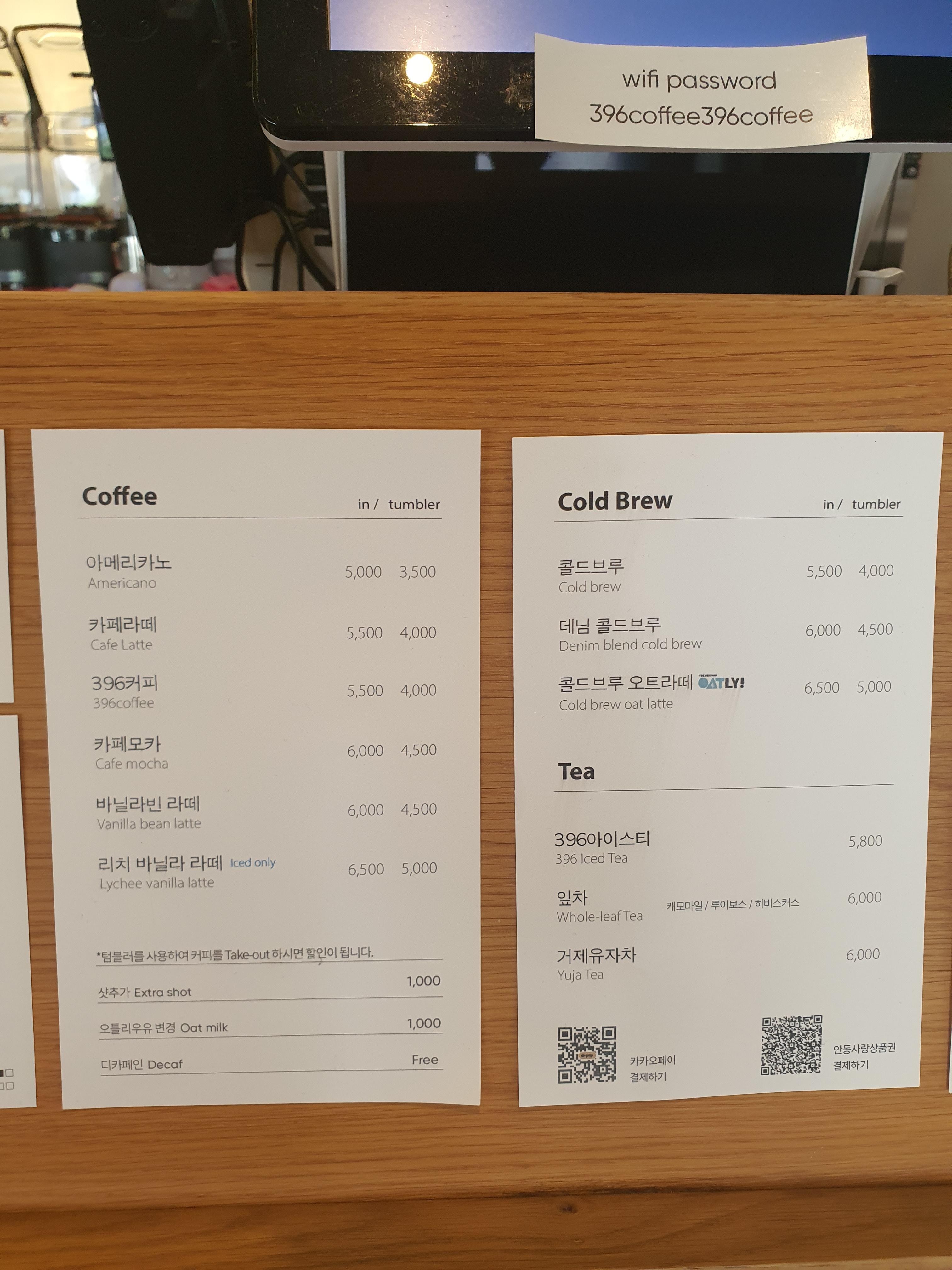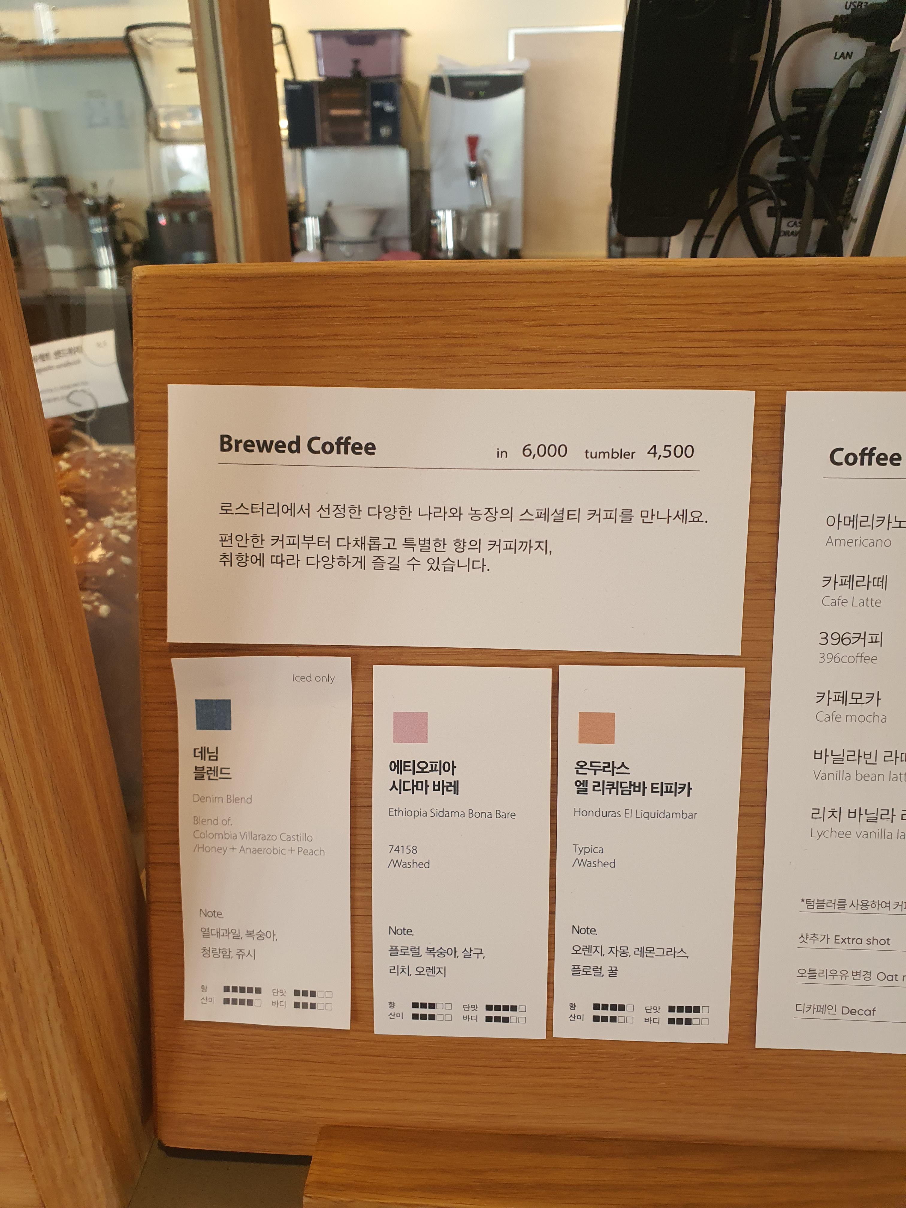 개인 텀블러를 이용하신다면, 커피를 저렴하게 맛보실 수 있습니다. 시그니처 메뉴인 '396 커피' 부터 계절메뉴 그리고 샌드위치까지 다양한 메유가 있습니다.