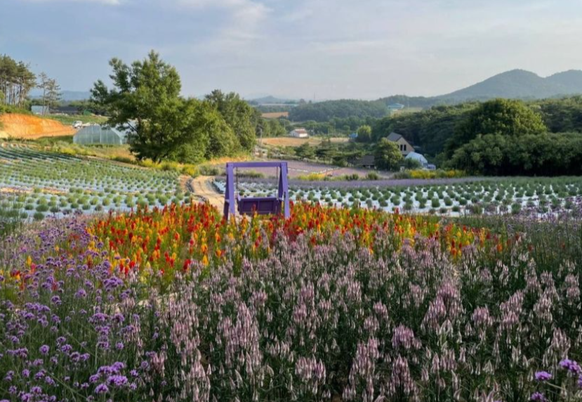 🔹 라벤더 밭 사이 산책로, 보라색 그네, 언덕 포토존
