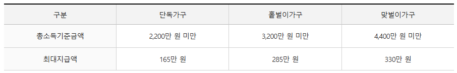 - 단독가구 : 총소득 2,200만원 미만일 경우, 최대 165만원 지원