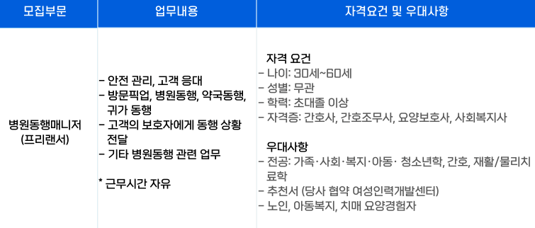지자체 공식 홈페이지 및 각 지역 수행기관(복지관, 노인돌봄센터 등)에서도 ‘병원동행매니저’ 채용공고 및 사업안내를 수시로 공지합니다.