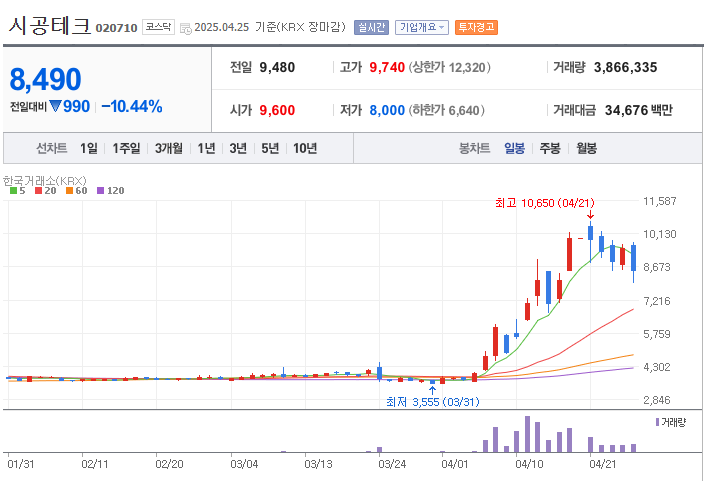 | 시공테크 | 박기석 회장-한덕수 전 총리 국민경제자문회의 동료 활동 | 4월 17일 24% 상승, 거래 정지 예고 |